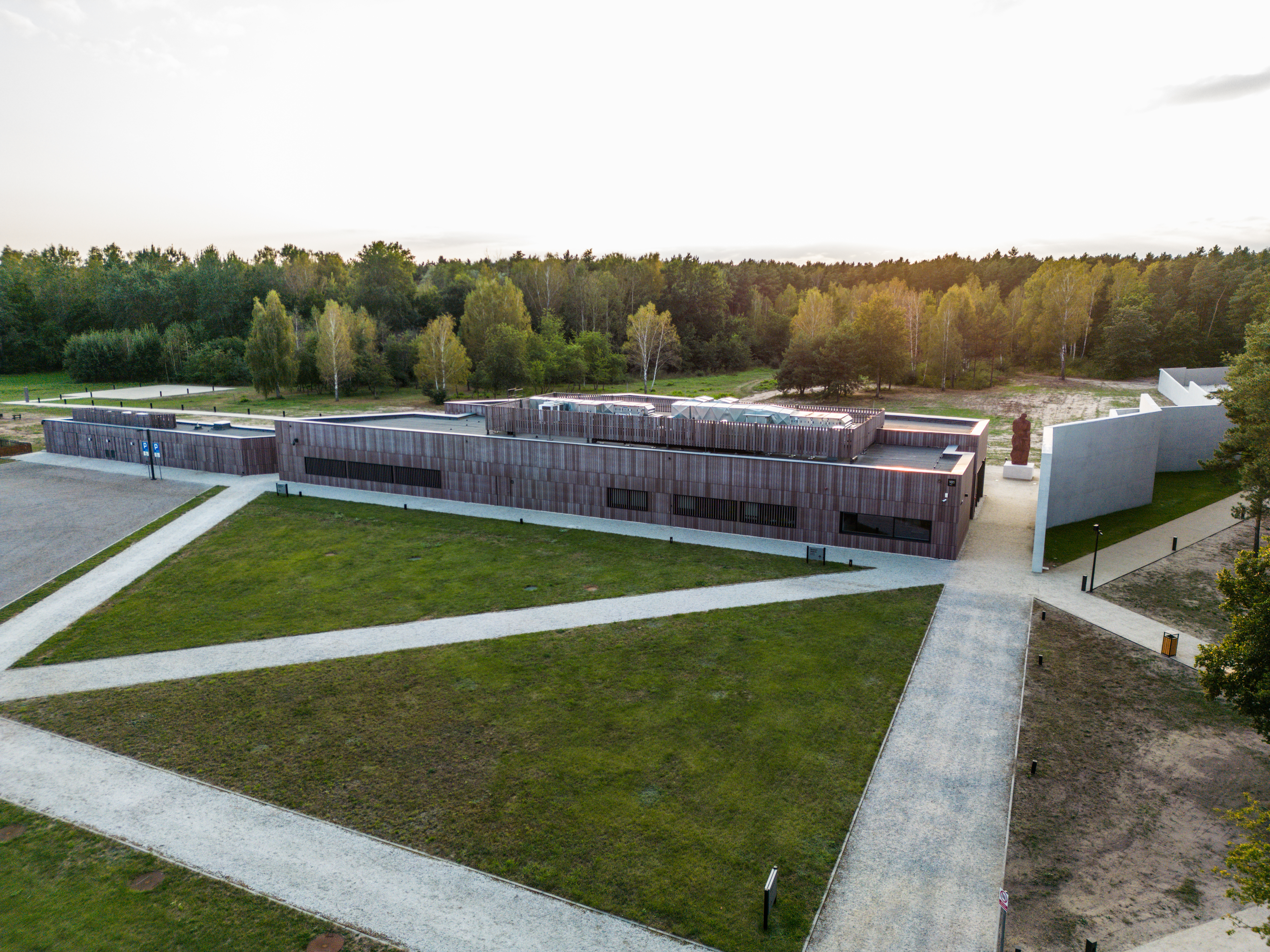 W budynku znajdują się również sala edukacyjna, punkt obsługi zwiedzających i biura. Z wnętrza zwiedzający mogą oglądać kluczowe punkty związane z dziejami obozu – bocznicę kolejową, na której zatrzymywały się transporty, i miejsce wybuchu powstania więźniów.